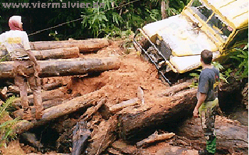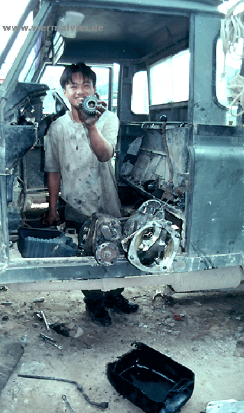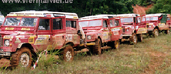 Von Tag zu Tag werden die Bedingungen härter. Trotzdem ist die Stimmung hervorragend. Jeder hatte gewusst, dass dies eine besondere Lebenserfahrung sein würde und keiner wird diese Zeit wohl je in seinem Leben vergessen. Die Organisation klappt mit kleinen Schwächen gut, wobei eigentlich nur die für uns Europäer zu scharfe Küche mit dem ewigen Einerlei aus Reis und Nudelgerichten (Spezialität: Fischkopf-Curry) zu einigem Murren führt. Gut dagegen die medizinische Versorgung: Verteilt über den gesamten Konvoi stehen ein Arzt und mehrere Sanitäter parat, die im Fall der Fälle über Funk Helikopter-Hilfe anfordern können. Das Konzept, entlang der Route durch kleine Basisstationen eine Kommunikationskette zur Außenwelt aufzubauen, wurde dieses Jahr zum ersten Mal praktiziert, nachdem letztes Jahr ein Team mit technischen Problemen am Fahrzeug erst nach einer Woche aus ihrer misslichen Lage befreit werden konnte. Schlafen auf diesem Abenteuer-Trip ist jetzt ein echtes Problem, da die Sonderprüfungen bis spät in die Nacht andauern und die Scoutteams, zu denen wir eingeteilt sind, nachts ganze Streckenabschnitte für die nachrückenden Teams gangbar machen. Wer früher von der Mutti das Spielen im Dreck verboten bekam, kann hier alles nachholen. – Waschen ist wegen der starken Strömung in den Flüssen nur selten möglich. – Alle kämpfen sich verbissen zum absoluten Höhepunkt ihrer selbstverordneten Odyssee durch. Die Sonderprüfung Nr. 17 mit dem klangvollen Beinamen „Terminator“ steht für Action pur, ganz im Sinne des Hollywood-Streifens. Eine Stunde Zeit haben die Teams, um zuerst im Fluss ihre Ideallinie zu finden, sich dann die Uferböschung hoch zu quälen und anschließend durch hundsgemeinen Weichsand zu baggern. Ist das geschafft, wartet auf die Crews das sogenannte „Elefanten-Loch“, ein bodenloses Morastfeld von 50m Länge. Ist auch das durchlitten, bleibt noch ein langer und tief ausgewaschener Steilhang. Hier zahlt sich die Routine des späteren Gesamtsieger-Teams aus Australien und die Motorkraft ihres Range Rover aus.