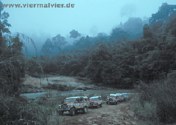 Die routiniert-lässige Art, wie Fahrer Shah seine rollende Antiquität durch jedes noch so tiefe Loch hindurchbugsiert, ist für mich vertrauensbildend, was uns jedoch nicht von tatkräftiger Hilfe beim schieben, ziehen, winchen und graben entbindet. Bald schon schließt sich die grüne Hölle um uns und der Dschungel wird begreifbar: Da ist die schwüle Hitze, die körperliche Anstrengung beim Instandsetzen weggeschwemmter Brücken, der unvermittelt einsetzende Regen, der Dreck auf der eigenen Haut und die vielen kleinen und großen Plagegeister. Insekten, Riesenameisen und widerliche, schleimige Blutegel, die man erst bemerkt, wenn die betroffenen Körperpartien bluten, machen uns anfangs zu schaffen. Der Umgang mit Abwehrsprays und das Abpflücken der Blutegel unter Einsatz eines Feuerzeugs (sogenanntes Egel-Toasten) wird zur vertrauten Routine. Die Einheimischen begegnen diesem Lebensraum mit einer Mischung aus Ehrfurcht und Aberglauben: Niemals soll man den Namen der Beherrscher des Dschungels, Tiger und Elefant, aussprechen oder sich etwa an einem der mächtigen Urwaldbäume „erleichtern“! Allerdings bekommen wir die scheuen Dschungelkönige nie zu Gesicht, nur indirekt, in Form von Fuß- abdrücken der großen Katzen und den zertrampelten Lagerstätten der Rüsseltiere. Mit gemischten Gefühlen im Bauch liegen wir nachts auf unseren Feldbetten, gegen den Regen nur notdürftig geschützt durch die große Plastikplane, die wir zwischen die Land Rover spannen. Selbst das Schnarchen des Nebenmannes ist nur sanfte Begleitakustik zu den geheimnisvollen Geräuschen aus dem Dschungel Dickicht.- Das Gefühl, von tausend Augenpaaren beobachtet zu werden, beschleicht uns auf beklemmende Art und Weise. Wir sind hier geduldete Gäste, die sich den Gesetzen des Dschungels unterzuordnen haben. Ein tiefes Erlebnis…..