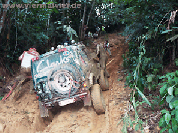 Dort fängt sofort die Schlammschlacht an. Bodenlose, zähe Pampe behindert unser Fortkommen. Schnell wird die Gruppe auseinandergezogen. Die Presseleute haben ihren eigenen Mini-Konvoi gebildet, der aus 5 Fahrzeugen des malaysischen Land Rover Clubs besteht. Eingepfercht zwischen Menschen und Gepäckstücken sitze ich im ältesten Fahrzeug der Gruppe, einem wind und wetter-gegerbten LR 109 Serie IIa von 1964 mit Nissan 6-Zylinder Dieselmotor. Das charaktervolle Fahrzeug hört auf den Namen „Old Man“ und hat bisher schon alle „Challenges“ ohne Probleme mitgemacht. Besonderes Merkmal dieses und der übrigen Serie III „Landy-Schätzchen“ sind Portalachsen aus dem in Malaysien bei der Armee eingesetzten Volvo Lappländer-Geländewagen. Vakuum-unterstützte Achs-Differentialsperren, mechanische PTO-Winden und grobstollige Simex Jungle-Trekker Reifen sind weitere Kennzeichen der äußerlich eher harmlos anmutenden Geländefahrzeuge. Vicky, der Präsident des LR-Clubs in Kuala Lumpur erklärt, dass alle Fahrzeuge speziell für die Bedingungen im Regenwald ausgerüstet sind und sich trotz ihres Alters bestens bewährt haben.