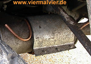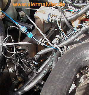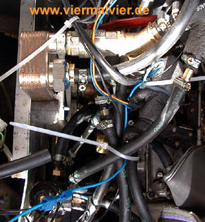 Ich baute eine Aluträgerplatte, die vorne am Kotflügel und hinten an der Motorspritzwand verschraubt ist, darauf montiert ist das 6/2-Wege-Ventil sowie der Wärmetauscher mit selbstgebauter Befestigung. Am Wärmetauscher ist noch ein manuelles Kugelventil montiert, mit dem man den Kühlwasserfluss unterbrechen kann, um bei evtl. Dieselbetrieb die Vorwärmung abzuschalten.