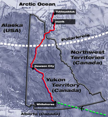 Über Dawson City, der berühmt-berüchtigten Goldgräberstadt, geht es den Dempster Highway hinauf über den Polarkreis nach Inuvik und von dort aus über den riesigen zugefrorenen Mackenzie-Fluß bis nach Tuktoyaktuk, direkt an der Beaufort-Sea.