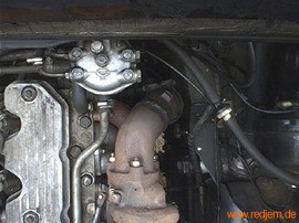 Es wurden die Krümmer des 200tdi Defender Motors eingebaut. Die Teile können 1 zu 1 ausgetauscht werden, alle Bohrungen und Dichtungen passen. Jetzt sitzt der Turbolader oben links über dem Zylinderkopf und es verbleibt genug Platz (es ist wenig genug) für das Lenkgetriebe. Das Fallrohr (Gussteil nach Turbolader) vom Discovery wurde zerschnitten und so gedreht wieder verschweißt, daß der Auspuff zwischen Spritzwand und Krümmer hindurchpasst (verflucht eng).