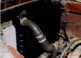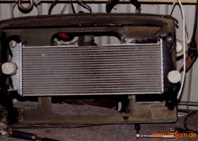 Für den original vorhanden Viskolüfter ist der Raum zwischen Motor und Kühler zu klein. Statt dessen wurde ein E-Lüfter montiert (erst mal der eines Ford Fiesta Diesel, ob die Leistung ausreichend ist, wird sich noch zeigen) gesteuert wird der Lüfter über einen BMW-Thermoschalter. Für den Thermoschalter wurde in das Thermostatgehäuse eine zusätzliche Bohrung mit Gewinde gedreht (Gehen sie zum Werkzeugmacher ihres Vertrauens)