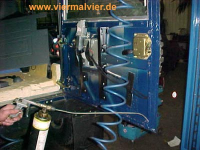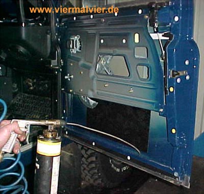 Als Erstes demontiert man die Innenverkleidung der vorderen Kotflügel. Nun hat man einen sehr guten Zugriff auf den dahinter liegenden Rahmenbereich. Mittels Schlauchaufsatz und Pistole den Rahmen versiegeln. Das Fahrzeug auf der Bühne hochheben. Von unten sind insbesondere die Rahmenausleger und die Hecktraverse gründlichst zu behandeln. Die Innenverkleidungen der Türen abmontieren. hierbei werden verschiedene Halteklipse zerbröseln oder ausleiern. Die Firma Matzker erneuert diese grundsätzlich genau so, wie die Kunststoff – führung der Türverriegelung. Verwendet man die ausgeleierten Klipse wieder, kann die Verkleidung zwar vorerst halten, aber ich kann es mir als recht unangenehm vorstellen, wenn nicht sogar gefährlich vorstellen, wenn die Innenverkleidung plötzlich auf dem Schoß liegt. An allen Türen sind die Innenprofile gründlich auszusprühen. Mit gründlich meine ich bis es unten wieder rausläuft.
