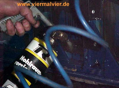 Die Ritze gründlich einsprühen. dabei müssen die Abflusslöcher der Türen frei sein und bei der Behandlung sollte das überflüssige Material hier ablaufen können.