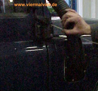 An den vorderen Türen jeweils eine Schraube pro Scharnier rausdrehen (Spritzwandseite).
