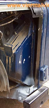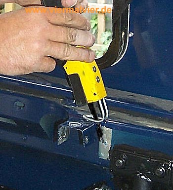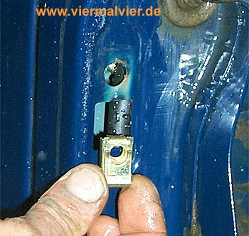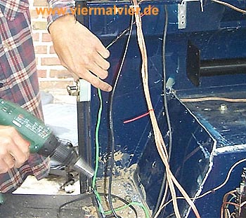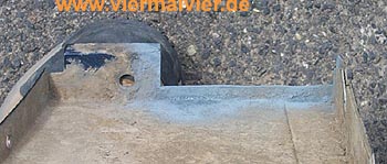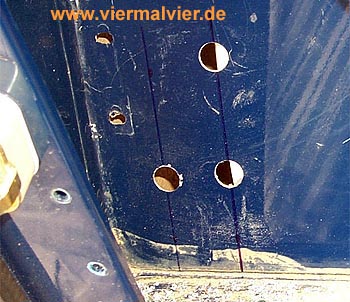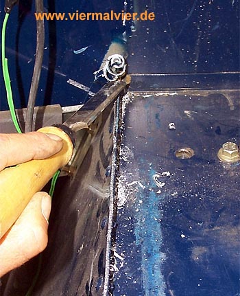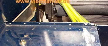 Den doppelten Rand habe ich stehen lassen. Die Blindnieten ausbohren und die innere Lippe wieder mittels Meissel raustrennen. In der Kehle Dichtmasse auftragen, Kante umbörteln, Löcher durch das untere Blech (Kotflügel) durchbohren. Solange die Dichtmasse noch frisch (weich) ist, in den Löchern Nieten einstecken und festziehen. Als Blindnieten sollten an dieser Stelle Sacklochnieten verwendet werden. Diese verhindern ein Eindringen von Wasser durch den Nietenkörper selbst. (Detailfotos werden noch nachgereicht)