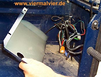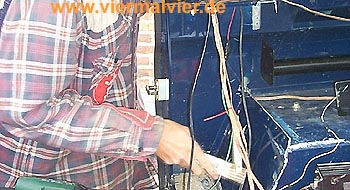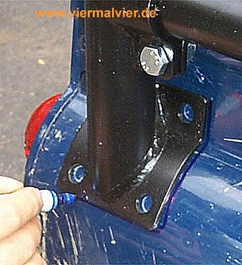 Nun sind alle 6 Füsse eingezeichnet und der 90 ist leergeräumt. Angefangen wird stets mit dem hinteren Teil des Käfigs. Hierzu werden beide Abdeckbleche der Kabelstränge an der Heckbeleuchtung demontiert.