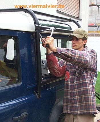 Den Käfig mit min. 2 Mann auf den 90 hiefen und ausrichten. Hierbei könnte man auf der Karosserie Panzerband kleben, um Kratzer zu vermeiden. Da bei meinem 90 eine Lackierung ansteht, haben wir uns das gespart.