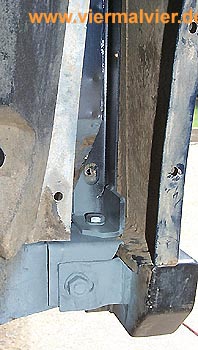 So nun kann der mitgelieferte Träger montiert werden. Er wird an dem unteren Winkel und der Spritzwand befestigt. Die Schrauben der Spritzwand nur minimal reindrehen, da der Kotflügel noch zwischen Träger und S-Wand geschoben wird. Der Kotflügel hat an der S-Wand Seite geschlossene und offene Löcher. Nur an den Stellen die Schrauben reindrehen wo die Löcher offen sind, die anderen Schrauben erst nachdem der K-Flügel wieder dran ist.