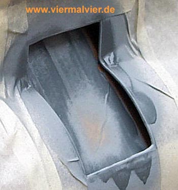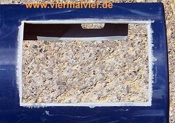 Anschliessend die Schnittkanten sorgfältig glatt schleifen. Hierbei ca. 1 – 3 mm um den Ausschnitt herum die Lackoberfläche (innen und aussen) mit 800er Nassschleifpapier anrauen (nicht abtragen). Dies gewährleistet eine gute Haftung der Grundierung.