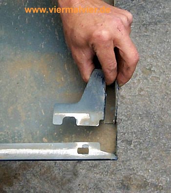 Den Überstand zweimal wie hier gezeigt einsägen und anschliessend die Kanten umbörteln. Anschleifen, grundieren, mit Dichtmasse versiegeln, lackieren.