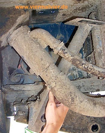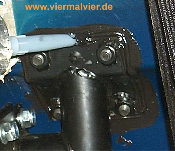 Die 4 Träger-Rohre und die untere Traverse sind an Ihren Platz. Nun kommt die Sache mit dem Spiel zwischen den Teilen. An alle Stellen wo der Käfig durch die Karosse geht (6) innen (unten eventuell innen und aussen) Dichtmasse auftragen. Nun ist zügiges Arbeiten angesagt. Keine Panik machen, aber einfach an der Sache dran bleiben. Die 1 Komponenten Dichtmasse bleibt min. 1 Stunde weich, aber wir brauchen ja vielleicht noch ein wenig Zeit für eventuelle Korrekturarbeiten. Den hinteren Käfig mit min. 2 Leuten auf den 90 hieven und an der richtigen Stelle absetzen. Die Verbindungen der Einzelteile des Käfigs sind ebenfalls nur *handfest* angezogen (ca. 4 mm Spiel). Als erstes werden die 4 Fusspunkte des Aussenkäfigs verschraubt, hierbei auf geraden Sitz der Moosgummi – Dichtungen achten. Nun die Streben, welche die hinteren und die mittleren Innenstützen verbinden und die Fusspunkte der Stützen vorne und hinten, festschrauben. Als letzten Schritt den Käfig aussen herum festschrauben. Bei uns hat alles gepasst und der Äussere Käfig war gerade. Die Verschraubungen haben wir zwar fest gezogen, aber nicht *fest fest*. Richtig *fest fest* wird der Käfig erst nach 2 Wochen Fahrbetrieb angezogen. Somit haben alle Teile ein wenig Zeit sich ordentlich zu setzen. Also nach 2 Wochen die Moosgummidichtungen kontrollieren / korrigieren und alle Schrauben *fest fest * ziehen.