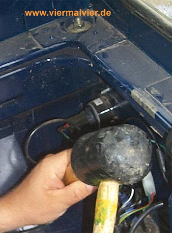 In den hinteren Ecken der Innenkotflügel wird ein Loch gestemmt. Einmessen laut SD Bauplan. Da der zur Verfügung stehende Arbeitsraum es nicht zulässt eine Säge zu verwenden, habe ich das Loch mit Hammer und Meissel rausgetrennt. Hierzu habe ich einen scharfen schmalen Holzmeissel verwendet da sich dieser hervorragend für Aluminium eignet. (oh liebe Schreiner unter euch steinigt mich nicht)