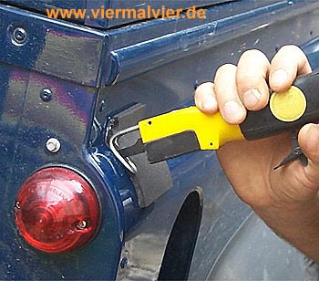 Mit ca. 1 bis 2 mm Abstand von der Dichtung das Viereck ausschneiden. Nur Mut, das geht wie Butter. Eine Säge wie hier abgebildet (Karosseriebau- Säge ) ist für diese Arbeit besonders zu empfehlen. Sie arbeitet mit Druckluft und kostet ca. 250,- DM Netto. Gut sortierte Werkzeugverleiher haben so etwas auch. Mit der Stichsäge würde ich hier nicht arbeiten, wegen der Wölbung besteht die Gefahr des Verhakens = fiese Beule.