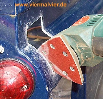 Nun bearbeiten wir die demontierten Kotflügel wie schon vorher den Body des 90. Das rechteckige Loch hatten wir ja bereits angezeichnet. Die Arbeitsschritte sind die gleichen, hier nur ein Bild des fertigen Loches.