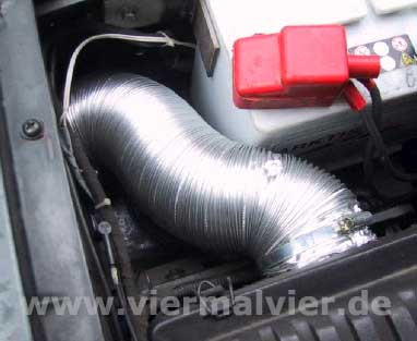 Im Innenkotflügel sind noch zwei 45° Bögen notwendig, um von der schrägen wieder in die waagerechte Position zu kommen. Der Spritzschutz muss zerschnitten werden und kann nur noch rechts und links von den Rundungen verwendet werden. Das EGR Ventil ist ausgebaut, die Originalansaugung vom Luftfiltergehäuse demontiert. Die Verbindung vom Luftfiltergehäuse zu dem ersten Abflussbogen habe ich mit einem Aluflexrohr aus dem Baumarkt hergestellt. Dieses bekommt man zwar nur in einem Durchmesser von 80mm aber mit Isolierband und einer Schelle klappt das schon. Am Stutzen des Luftfiltergehäuses muss unten noch eine kleine Kunststoffnase weggeschliffen werden,damit das Aluflexrohr schön dicht anschließen kann.