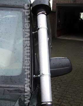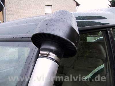 Persönlich möchte ich noch ein paar Punkte aus meiner Erfahrung zu diesem Umbau ergänzen. Die A-Säule ist an der Innenseite mit Verstärkungen versehen. Diese sollten beim Bohren „erwischt“ werden, weil dort mehr Material vorhanden ist und der Originalschnorchel auch dort befestigt wird. Vor dem Bohren mit einem TÜV Ingenieur reden: bei der nächsten HU könnte bemängelt werden, das die A-Säule geschwächt wurde. Anstatt Silikon besser Karosseriedichtmasse verwenden, da diese UV- beständiger ist und das Aluminium nicht angreift. Silikon härtet meistens auf Basis von Essigsäure aus und diese greift das Aluminium an.