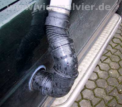 Am unteren Ende des Alurohrs folgt der Gummifaltenbalg, das LR Teil Nummer 2. Ab hier bin ich mit handelsüblichem 70er Abflussrohr weiter gegangen. Mittels zwei 90° Bögen befindet sich das Rohr bereits im Innenkotflügel. Den Ausschnitt im Kotflügel schneidet man am besten mit einem Dremel aus, anschließend die Kanten grundieren und mit Kantenschutz und Dichtmasse versehen. Im Innenkotflügel wird das Abflussrohr bis an die Stelle weitergeführt, an der bereits werksseitig vorne ein großes Loch vom Motorraum zum Innenkotflügel vorhanden ist. Dieses Loch muss man aber noch etwas vergrößern, weil der 90° Bogen dort schräg eingesetzt wird.