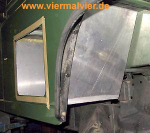 Zum späteren Einbau der Klappe wird nun eine Sperrholzplatte als Vorderseite der Kiste passend zugesägt. Diese Konstruktion hat gegenüber Holzleisten den Vorteil, das evtl. rutschende, schwere Teile im Fach keine Beulen an der Karosserieaußenseite zur Folge haben. Zunächst werden Rad, Verstrebung und Schrauben zwischen Aussenkotflügel und Schweller entfernt. Gegebenenfalls wird der Spalt zwischen den Verstärkungsprofilen nachgearbeitet, damit die Blechkante dort zwischenpasst. Das Aussenblech wird mit Gefühl vorgezogen und die Kiste bis zum einrasten eingeschoben. Es ist extrem schwierig, einmal eingerastete Kisten wieder heraus zu bekommen.