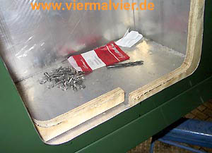 Die Kiste wird auf der Innenseite an die Verstärkungsprofile festgenietet. Auf der Aussenseite werden die Befestigungspunkte des Schwellerblechs genutzt und nach unten verschraubt. Für die anschliessende Abdichtung der Blechfalzen und Anschlüsse könnt ihr z.B. Sikaflex verwenden. Nach dem antrocknen der Dichtmasse wird die zuvor gefertigte Holzplatte so in zwei Teile gesägt, das sie durch das Loch innerhalb des Faches wieder zusammengesetzt werden kann. Die Konturen der Fachöffnung werden übertragen und ausgesägt. Nun wird die Klappe nach Anleitung eingebaut.