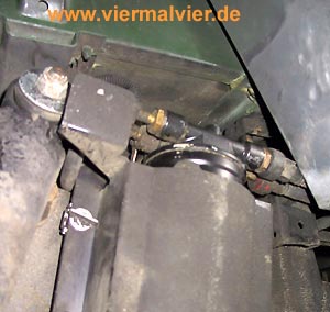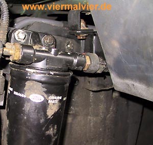 Auf der Fahrerseite war der Dieselfilter im Weg. Ich habe den Filterhalter etwas nach links versetzt. Die rechte Schraube sitzt jetzt im linken Loch. Die fehlenden Löcher habe ich ins Halteblech gebohrt und das Abdeckblech modifiziert. Alternativ hätten auch die Kisten bei der Konstruktion entsprechende Aussparungen haben können.