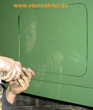 Danach wird das Loch für die Klappe ins Aussenblech gesägt. Der Ausschnitt wird später zur Klappenfüllung weiterverwendet.