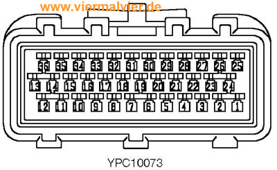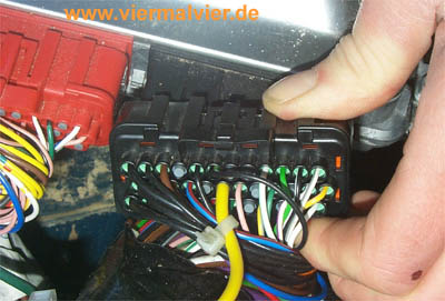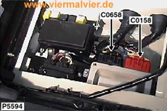 The gauge has 5 contacts: 2 for the light, one to connect to a switched line with power on when contact (don’t use the + from the clock here), one earth (here you can use the – from the clock) and one for the signals. This last one was wired to the ECU box under the passenger seat. On the silver box (ECU) you see 2 large connectors on the front and 2 on the rear. Use the rear black one (C0658).