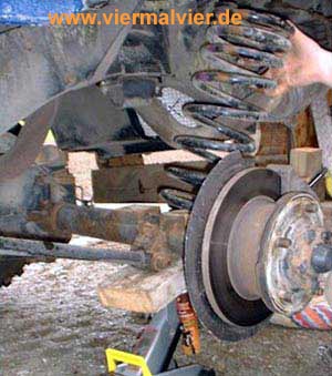 Neue Feder rein, Stoßdämpfer oben befestigen, Achse heben, alles fixieren.
