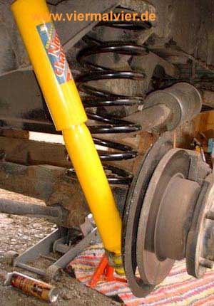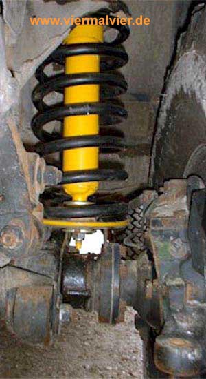 Nun die Achse weiter absenken und Feder herausnehmen. Jetzt wieder das gleiche Spiel: Feder rein, neuen Dämpfer in den Trichter, von oben einsetzen und wieder alles fixieren. Wir haben vorne auch noch Gummiringe unter die Federn eingelegt (sind nicht unbedingt notwendig). Das Ergebnis: 40 mm höher, und die Verschränkung ist um einiges besser geworden.