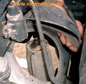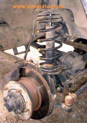 Vorne ist nur ein geringfügig größerer Aufwand notwendig. Kunststoffdeckel am Kotflügel im Motorraum entfernen, untere Dämpferschraube lösen, Trichter oberhalb der Feder lösen, dann den Dämpfer nach oben ausziehen.